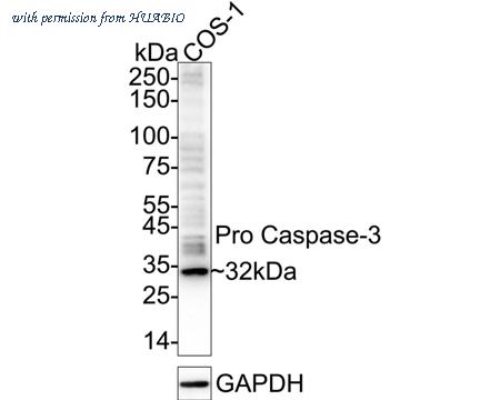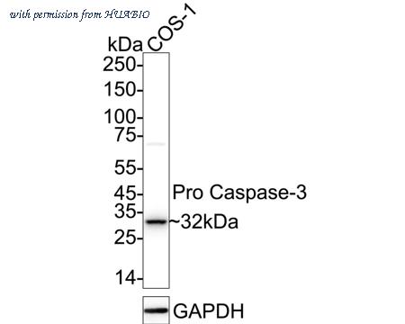 Western blot analysis of Pro Caspase-3 on COS-1 cell lysates with Rabbit anti-Pro Caspase-3 antibody (HA750048) at 1/5,000 dilution. Lysates/proteins at 20 µg/Lane. Predicted band size: 32 kDa Observed band size: 32 kDa Exposure time: 59 seconds; ECL: K1801; 4-20% SDS-PAGE gel. Proteins were transferred to a PVDF membrane and blocked with 5% NFDM/TBST for 1 hour at room temperature. The primary antibody (HA750048) at 1/5,000 dilution was used in primary antibody dilution (K1803) at 4℃ overnight. Goat Anti-Rabbit IgG - HRP Secondary Antibody (HA1001) at 1/50,000 dilution was used for 1 hour at room temperature.
