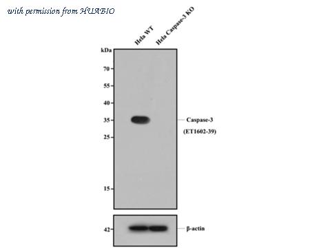 All lanes: Western blot analysis of Caspase-3 with anti-Caspase-3 antibody [SR03-01] (HA750048) at 1:500 dilution. Lane 1: Wild-type Hela whole cell lysate (20 µg). Lane 2: Caspase-3 knockout Hela whole cell lysate (20 µg). ET1602-39 was shown to specifically react with Caspase-3 in wild-type Hela cells. No band was observed when Caspase-3 knockout sample was tested. Wild-type and Caspase-3 knockout samples were subjected to SDS-PAGE. Proteins were transferred to a PVDF membrane and blocked with 5% NFDM in TBST for 1 hour at room temperature. The primary antibody (ET1602-39, 1/500) and Loading control antibody (Rabbit anti-β-actin, R1207-1, 1/1,000) was used in 5% BSA at room temperature for 2 hours. Goat Anti-Rabbit IgG-HRP Secondary Antibody (HA1001) at 1:200,000 dilution was used for 1 hour at room temperature.