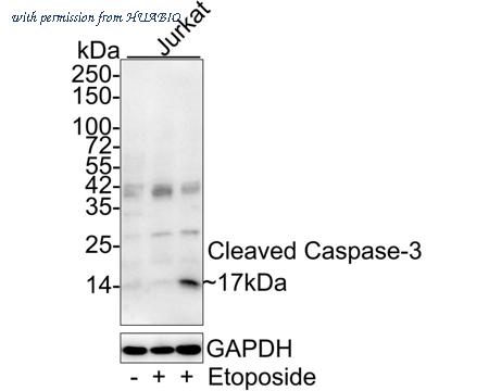 Western blot analysis of Cleaved Caspase-3 on different lysates with Rabbit anti-Cleaved Caspase-3 antibody (HA750053) at 1/1,000 dilution. Lane 1: Jurkat cell lysate (20 µg/Lane) Lane 2: Jurkat treated with 25μM Etoposide for 5 hours cell lysate (20 µg/Lane) Lane 3: Jurkat treated with 25μM Etoposide for 16 hours cell lysate (20 µg/Lane) Predicted band size: 17 kDa Observed band size: 17 kDa Exposure time: 3 minutes; ECL: K1802; 4-20% SDS-PAGE gel. Proteins were transferred to a PVDF membrane and blocked with 5% NFDM/TBST for 1 hour at room temperature. The primary antibody (HA750053) at 1/1,000 dilution was used in 5% NFDM/TBST at 4℃ overnight. Goat Anti-Rabbit IgG - HRP Secondary Antibody (HA1001) at 1/50,000 dilution was used for 1 hour at room temperature.
