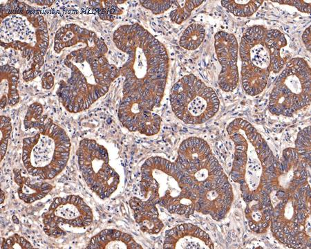 Immunohistochemical analysis of paraffin-embedded human colon carcinoma tissue with Rabbit anti-Cleaved Caspase-3 antibody (ET1602-47) at 1/100 dilution. The section was pre-treated using heat mediated antigen retrieval with Tris-EDTA buffer (pH 9.0) for 20 minutes. The tissues were blocked in 1% BSA for 20 minutes at room temperature, washed with ddH2O and PBS, and then probed with the primary antibody (ET1602-47) at 1/100 dilution for 1 hour at room temperature. The detection was performed using an HRP conjugated compact polymer system. DAB was used as the chromogen. Tissues were counterstained with hematoxylin and mounted with DPX.