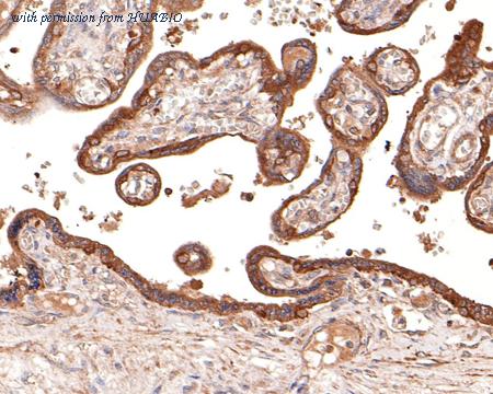 Immunohistochemical analysis of paraffin-embedded human placenta tissue with Rabbit anti-Cleaved Caspase-3 antibody (HA750053) at 1/100 dilution. The section was pre-treated using heat mediated antigen retrieval with Tris-EDTA buffer (pH 9.0) for 20 minutes. The tissues were blocked in 1% BSA for 20 minutes at room temperature, washed with ddH2O and PBS, and then probed with the primary antibody (HA750053) at 1/100 dilution for 1 hour at room temperature. The detection was performed using an HRP conjugated compact polymer system. DAB was used as the chromogen. Tissues were counterstained with hematoxylin and mounted with DPX.