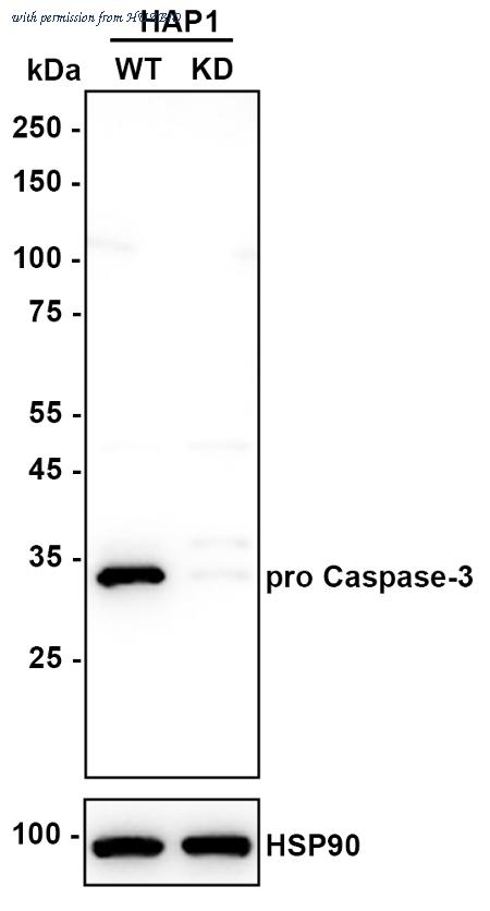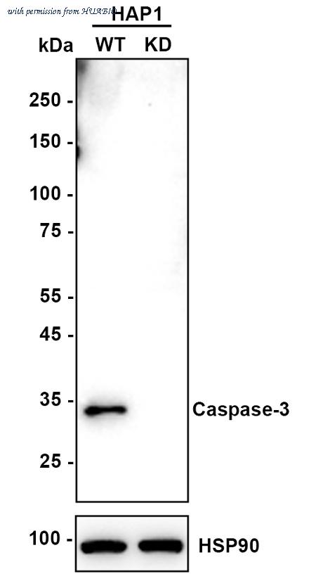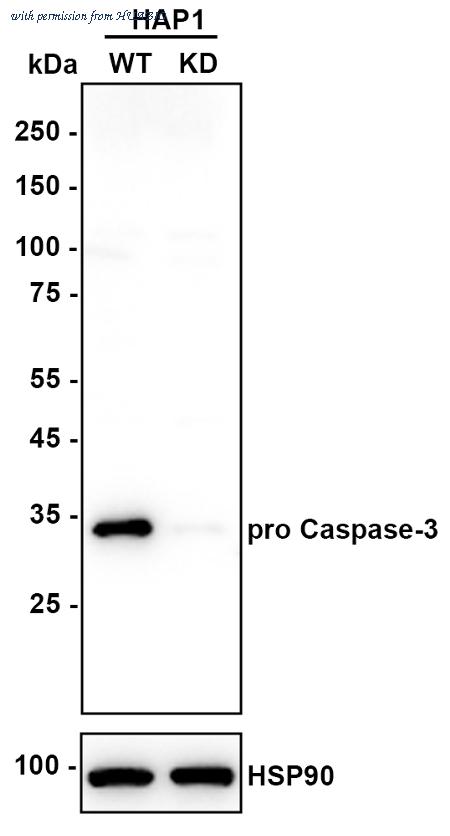 Western blot analysis of Cleaved+pro Caspase-3 on different lysates with Rabbit anti-Cleaved+pro Caspase-3 antibody (HA722367) at 1/2,000 dilution. Lane 1: HAP1-parental cell lysate Lane 2: HAP1-Cleaved+pro Caspase-3 KD cell lysate Lysates/proteins at 10 µg/Lane. Predicted band size: 32 kDa Observed band size: 32 kDa Exposure time: 40 seconds; ECL: K1801; 4-20% SDS-PAGE gel. Proteins were transferred to a PVDF membrane and blocked with 5% NFDM/TBST for 1 hour at room temperature. The primary antibody (HA722367) at 1/2,000 dilution was used in K1803 at 4℃ overnight. Goat Anti-Rabbit IgG - HRP Secondary Antibody (HA1001) at 1/50,000 dilution was used for 1 hour at room temperature.