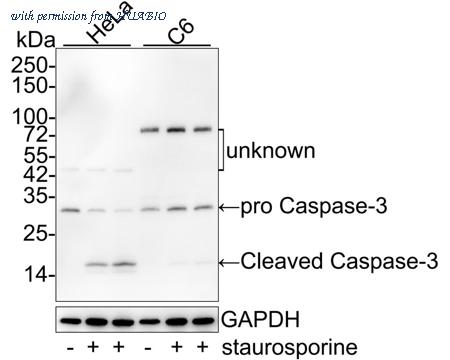 Western blot analysis of Cleaved+pro Caspase-3 on different lysates with Rabbit anti-Cleaved+pro Caspase-3 antibody (HA750159) at 1/1,000 dilution. Lane 1: HeLa cell lysate Lane 2: HeLa treated with 1μM staurosporine for 4 hours cell lysate Lane 3: HeLa treated with 3μM staurosporine for 4 hours cell lysate Lane 4: C6 cell lysate Lane 5: C6 treated with 1μM staurosporine for 4 hours cell lysate Lane 6: C6 treated with 3μM staurosporine for 4 hours cell lysate Lysates/proteins at 20 µg/Lane. Predicted band size: 32/17 kDa Observed band size: 32/17 kDa Exposure time: 3 seconds; ECL: K1801; 4-20% SDS-PAGE gel. Proteins were transferred to a PVDF membrane and blocked with 5% NFDM/TBST for 1 hour at room temperature. The primary antibody (HA750159) at 1/1,000 dilution was used in 5% NFDM/TBST at 4℃ overnight. Goat Anti-Rabbit IgG - HRP Secondary Antibody (HA1001) at 1/50,000 dilution was used for 1 hour at room temperature.