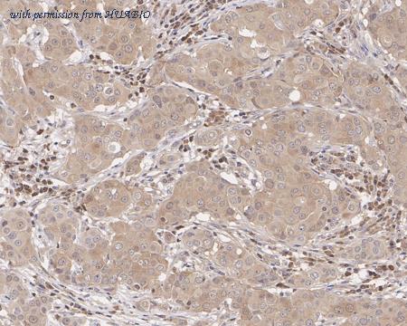 Immunohistochemical analysis of paraffin-embedded human breast cancer tissue with Rabbit anti-Caspase-3 p12 antibody (HA722235) at 1/200 dilution. The section was pre-treated using heat mediated antigen retrieval with Tris-EDTA buffer (pH 9.0) for 20 minutes. The tissues were blocked in 1% BSA for 20 minutes at room temperature, washed with ddH2O and PBS, and then probed with the primary antibody (HA722235) at 1/200 dilution for 1 hour at room temperature. The detection was performed using an HRP conjugated compact polymer system. DAB was used as the chromogen. Tissues were counterstained with hematoxylin and mounted with DPX.