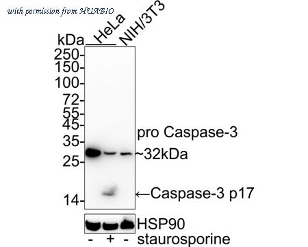 Western blot analysis of Cleaved+pro Caspase-3 on different lysates with Rabbit anti-Cleaved+pro Caspase-3 antibody (HA722367) at 1/1,000 dilution. Lane 1: HeLa cell lysate Lane 2: HeLa treated with 1μM staurosporine for 4 hours cell lysate Lane 3: NIH/3T3 cell lysate Lysates/proteins at 20 µg/Lane. Predicted band size: 32 kDa Observed band size: 32/17 kDa Exposure time: 2 minutes 7 seconds; ECL: K1801; 4-20% SDS-PAGE gel. Proteins were transferred to a PVDF membrane and blocked with 5% NFDM/TBST for 1 hour at room temperature. The primary antibody (HA722367) at 1/1,000 dilution was used in 5% NFDM/TBST at 4℃ overnight. Goat Anti-Rabbit IgG - HRP Secondary Antibody (HA1001) at 1/50,000 dilution was used for 1 hour at room temperature.