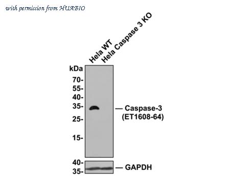 Western blot analysis of Caspase-3 with anti-Caspase-3 antibody (ET1608-64) at 1:2,000 dilution. Lane 1: Wild-type Hela whole cell lysate (10 µg). Lane 2: Caspase-3 knockout Hela whole cell lysate (10 µg). Proteins were transferred to a PVDF membrane and blocked with 5% NFDM in TBST for 1 hour at room temperature. The primary antibody (ET1608-64, 1/2,000) was used in 5% BSA at room temperature for 2 hours. Goat Anti-Rabbit IgG-HRP Secondary Antibody (HA1001) at 1/50,000 dilution was used for 1 hour at room temperature.