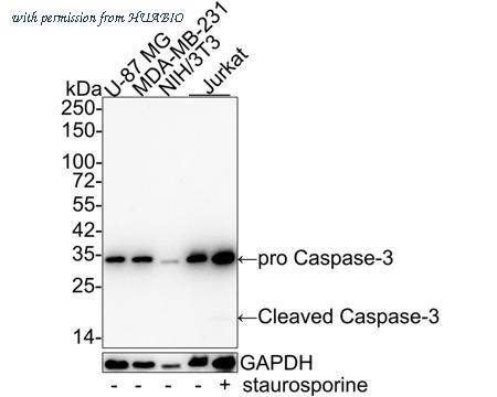 Western blot analysis of Cleaved+pro Caspase-3 on different lysates with Rabbit anti-Cleaved+pro Caspase-3 antibody (ET1608-64) at 1/5,000 dilution. Lane 1: U-87 MG cell lysate Lane 2: MDA-MB-231 cell lysate Lane 3: NIH/3T3 cell lysate Lane 4: Jurkat cell lysate Lane 5: Jurkat treated with 1μM staurosporine for 3 hours cell lysate Lysates/proteins at 15 µg/Lane. Predicted band size: 32/17 kDa Observed band size: 32/17 kDa Exposure time: 1 minute 2 seconds; 4-20% SDS-PAGE gel. Proteins were transferred to a PVDF membrane and blocked with 5% NFDM/TBST for 1 hour at room temperature. The primary antibody (ET1608-64) at 1/5,000 dilution was used in 5% NFDM/TBST at 4℃ overnight. Goat Anti-Rabbit IgG - HRP Secondary Antibody (HA1001) at 1:50,000 dilution was used for 1 hour at room temperature.