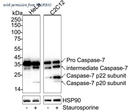 Western blot analysis of Caspase-7 on different lysates with Rabbit anti-Caspase-7 antibody (HA723558) at 1/5,000 dilution. Lane 1: HeLa cell lysate Lane 2: HeLa treated with 1μM staurosporine for 3 hours cell lysate Lane 3: C2C12 cell lysate Lane 4: C2C12 treated with 1μM staurosporine for 3 hours cell lysate Lysates/proteins at 20 µg/Lane. Predicted band size: 34 kDa Observed band size: 34/32/20/18 kDa Exposure time: 2 minute 30 seconds; ECL: K1801; 4-20% SDS-PAGE gel. Proteins were transferred to a PVDF membrane and blocked with 5% NFDM/TBST for 1 hour at room temperature. The primary antibody (HA723558) at 1/5,000 dilution was used in primary antibody dilution (K1803) at 4℃ overnight. Goat Anti-Rabbit IgG - HRP Secondary Antibody (HA1001) at 1/50,000 dilution was used for 1 hour at room temperature.