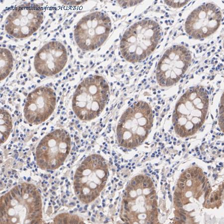 Immunohistochemical analysis of paraffin-embedded human colon tissue with Rabbit anti-Caspase-7 antibody (HA751482) at 1/200 dilution. The section was pre-treated using heat mediated antigen retrieval with Tris-EDTA buffer (pH 9.0) for 20 minutes. The tissues were blocked in 1% BSA for 20 minutes at room temperature, washed with ddH2O and PBS, and then probed with the primary antibody (HA751482) at 1/200 dilution for 1 hour at room temperature. The detection was performed using an HRP conjugated compact polymer system. DAB was used as the chromogen. Tissues were counterstained with hematoxylin and mounted with DPX.
