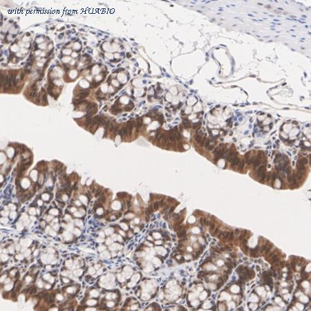 Immunohistochemical analysis of paraffin-embedded mouse colon tissue with Rabbit anti-Caspase-7 antibody (HA723558) at 1/1,000 dilution. The section was pre-treated using heat mediated antigen retrieval with Tris-EDTA buffer (pH 9.0) for 20 minutes. The tissues were blocked in 1% BSA for 20 minutes at room temperature, washed with ddH2O and PBS, and then probed with the primary antibody (HA723558) at 1/1,000 dilution for 1 hour at room temperature. The detection was performed using an HRP conjugated compact polymer system. DAB was used as the chromogen. Tissues were counterstained with hematoxylin and mounted with DPX.