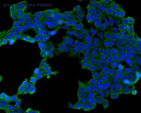 Immunocytochemistry analysis of 293T cells labeling TIM 3 with Mouse anti-TIM 3 antibody (EM1701-18) at 1/50 dilution. Cells were fixed in 4% paraformaldehyde for 30 minutes, permeabilized with 0.1% Triton X-100 in PBS for 15 minutes, and then blocked with 2% BSA for 30 minutes at room temperature. Cells were then incubated with Mouse anti-TIM 3 antibody (EM1701-18) at 1/50 dilution in 2% BSA overnight at 4 ℃. Goat Anti-Mouse IgG H&L (iFluor™ 488, HA1125) was used as the secondary antibody at 1/1,000 dilution. Nuclear DNA was labelled in blue with DAPI.