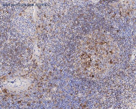 Immunohistochemical analysis of paraffin-embedded human spleen tissue using anti-Tim3 antibody. Counter stained with hematoxylin.