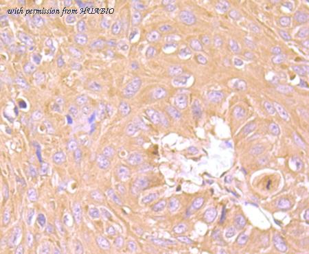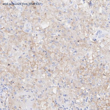 Immunohistochemical analysis of paraffin-embedded human lung cancer tissue with Rabbit anti-TIM 3 antibody (HA723854) at 1/1,000 dilution. The section was pre-treated using heat mediated antigen retrieval with Tris-EDTA buffer (pH 9.0) for 20 minutes. The tissues were blocked in 1% BSA for 20 minutes at room temperature, washed with ddH2O and PBS, and then probed with the primary antibody (HA723854) at 1/1,000 dilution for 1 hour at room temperature. The detection was performed using an HRP conjugated compact polymer system. DAB was used as the chromogen. Tissues were counterstained with hematoxylin and mounted with DPX.