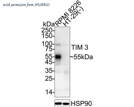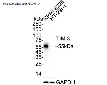 Western blot analysis of TIM 3 on different lysates with Rabbit anti-TIM 3 antibody (HA751599) at 1/2,000 dilution. Lane 1: RPMI 8226 cell lysate (20 µg/Lane) Lane 2: HT-29 cell lysate (negative) (20 µg/Lane) Predicted band size: 33 kDa Observed band size: 55 kDa Exposure time: 5 seconds; ECL: K1801; 4-20% SDS-PAGE gel. Proteins were transferred to a PVDF membrane and blocked with 5% NFDM/TBST for 1 hour at room temperature. The primary antibody (HA751599) at 1/2,000 dilution was used in primary antibody dilution (K1803) at 4℃ overnight. Goat Anti-Rabbit IgG - HRP Secondary Antibody (HA1001) at 1/50,000 dilution was used for 1 hour at room temperature.