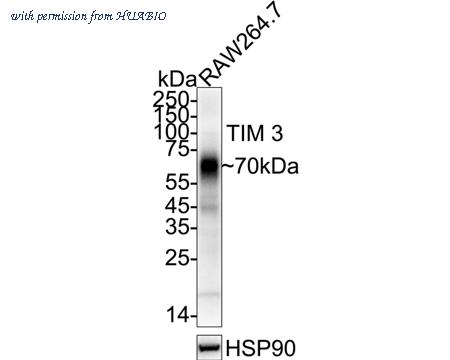 Western blot analysis of TIM 3 on RAW264.7 cell lysates with Rabbit anti-TIM 3 antibody (HA723854) at 1/2,000 dilution. Lysates/proteins at 20 µg/Lane. Predicted band size: 33 kDa Observed band size: 70 kDa Exposure time: 1 minute; ECL: K1802; 4-20% SDS-PAGE gel. Proteins were transferred to a PVDF membrane and blocked with 5% NFDM/TBST for 1 hour at room temperature. The primary antibody (HA723854) at 1/2,000 dilution was used in 5% NFDM/TBST at 4℃ overnight. Goat Anti-Rabbit IgG - HRP Secondary Antibody (HA1001) at 1/50,000 dilution was used for 1 hour at room temperature.