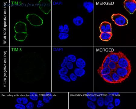 Immunocytochemistry analysis of RPMI 8226 (positive) and HT-29 (negative) labeling TIM 3 with Mouse anti-TIM 3 antibody (HA601442) at 1/100 dilution. Cells were fixed in 4% paraformaldehyde for 15 minutes at room temperature, permeabilized with 0.1% Triton X-100 in PBS for 15 minutes at room temperature, then blocked with 1% BSA in 10% negative goat serum for 1 hour at room temperature. Cells were then incubated with Mouse anti-TIM 3 antibody (HA601442) at 1/100 dilution in 1% BSA in PBST overnight at 4 ℃. Goat Anti-Mouse IgG H&L (iFluor™ 488, HA1125) was used as the secondary antibody at 1/1,000 dilution. PBS instead of the primary antibody was used as the secondary antibody only control. Nuclear DNA was labelled in blue with DAPI. beta Tubulin (ET1602-4, red) was stained at 1/100 dilution overnight at +4℃. Goat Anti-Rabbit IgG H&L (iFluor™ 594, HA1122) were used as the secondary antibody at 1/1,000 dilution.