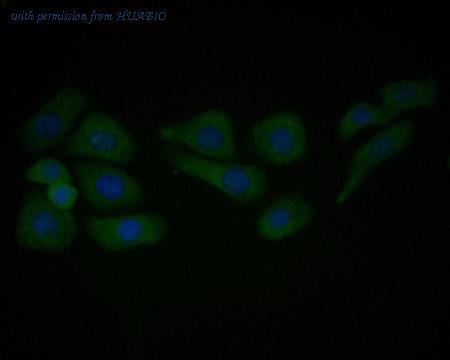 ICC staining of Caveolin-1 in SKOV-3 cells (green). Formalin fixed cells were permeabilized with 0.1% Triton X-100 in TBS for 10 minutes at room temperature and blocked with 1% Blocker BSA for 15 minutes at room temperature. Cells were probed with the primary antibody (EM1901-87, 1/50) for 1 hour at room temperature, washed with PBS. Alexa Fluor®488 Goat anti-Mouse IgG was used as the secondary antibody at 1/1,000 dilution. The nuclear counter stain is DAPI (blue).
