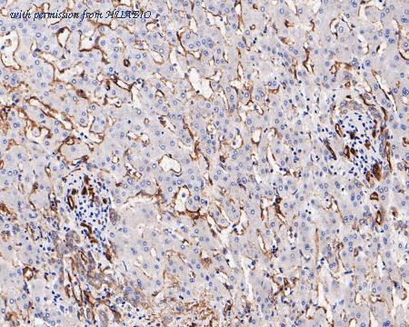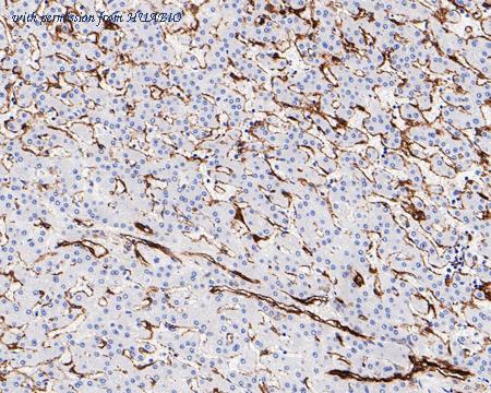Immunohistochemical analysis of paraffin-embedded human liver tissue with Mouse anti-Caveolin-1 antibody (HA601005) at 1/800 dilution. The section was pre-treated using heat mediated antigen retrieval with Tris-EDTA buffer (pH 9.0) for 20 minutes. The tissues were blocked in 1% BSA for 20 minutes at room temperature, washed with ddH2O and PBS, and then probed with the primary antibody (HA601005) at 1/800 dilution for 1 hour at room temperature. The detection was performed using an HRP conjugated compact polymer system. DAB was used as the chromogen. Tissues were counterstained with hematoxylin and mounted with DPX.