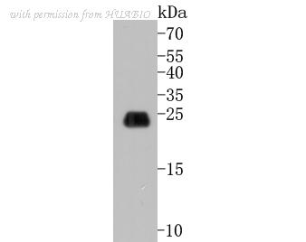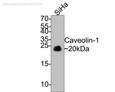 Western blot analysis of Caveolin-1 on SiHa cell lysates with Mouse anti-Caveolin-1 antibody (HA601005) at 1/500 dilution. Lysates/proteins at 10 µg/Lane. Predicted band size: 20 kDa Observed band size: 20 kDa Exposure time: 1 minute; 15% SDS-PAGE gel. Proteins were transferred to a PVDF membrane and blocked with 5% NFDM/TBST for 1 hour at room temperature. The primary antibody (HA601005) at 1/500 dilution was used in 5% NFDM/TBST at room temperature for 2 hours. Goat Anti-Mouse IgG - HRP Secondary Antibody (HA1006) at 1:100,000 dilution was used for 1 hour at room temperature.