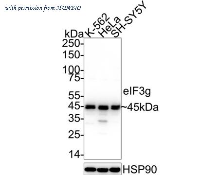 Western blot analysis of eIF3g on different lysates with Rabbit anti-eIF3g antibody (HA751288) at 1/25,000 dilution. Lane 1: K-562 cell lysate Lane 2: HeLa cell lysate Lane 3: SH-SY5Y cell lysate Lysates/proteins at 20 µg/Lane. Predicted band size: 36 kDa Observed band size: 45 kDa Exposure time: 4 seconds; ECL: K1801; 4-20% SDS-PAGE gel. Proteins were transferred to a PVDF membrane and blocked with 5% NFDM/TBST for 1 hour at room temperature. The primary antibody (HA751288) at 1/25,000 dilution was used in 5% NFDM/TBST at 4℃ overnight. Goat Anti-Rabbit IgG - HRP Secondary Antibody (HA1001) at 1/50,000 dilution was used for 1 hour at room temperature.
