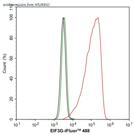 Flow cytometric analysis of HeLa cells labeling eIF3g. Cells were fixed and permeabilized. Then stained with the primary antibody (HA723103, 1/1,000) (red) compared with Rabbit IgG Isotype Control (green). After incubation of the primary antibody at +4℃ for an hour, the cells were stained with a iFluor™ 488 conjugate-Goat anti-Rabbit IgG Secondary antibody (HA1121) at 1/1,000 dilution for 30 minutes at +4℃. Unlabelled sample was used as a control (cells without incubation with primary antibody; black).
