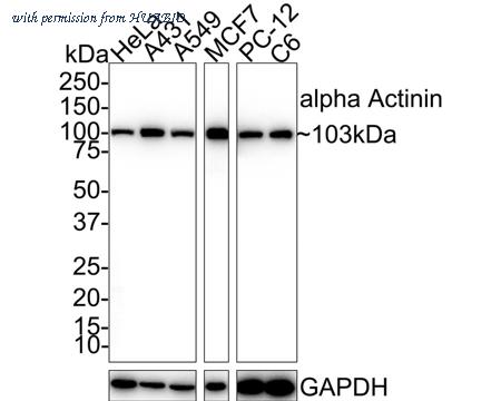 Western blot analysis of alpha Actinin on different lysates with Mouse anti-alpha Actinin antibody (EM1901-52) at 1/1,000 dilution. Lane 1: HeLa cell lysate Lane 2: A431 cell lysate Lane 3: A549 cell lysate Lane 4: MCF7 cell lysate Lane 5: PC-12 cell lysate Lane 6: C6 cell lysate Lysates/proteins at 20 µg/Lane. Predicted band size: 103 kDa Observed band size: 103 kDa Exposure time: 1 minute; 4-20% SDS-PAGE gel. Proteins were transferred to a PVDF membrane and blocked with 5% NFDM/TBST for 1 hour at room temperature. The primary antibody (EM1901-52) at 1/1,000 dilution was used in 5% NFDM/TBST at 4℃ overnight. Goat Anti-Mouse IgG - HRP Secondary Antibody (HA1006) at 1/50,000 dilution was used for 1 hour at room temperature.
