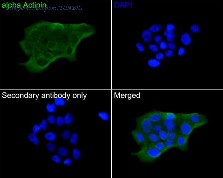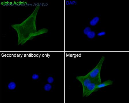Immunocytochemistry analysis of A431 cells labeling alpha Actinin with Mouse anti-alpha Actinin antibody (EM1901-52) at 1/50 dilution. Cells were fixed in 4% paraformaldehyde for 30 minutes, permeabilized with 0.1% Triton X-100 in PBS for 15 minutes, and then blocked with 2% BSA for 30 minutes at room temperature. Cells were then incubated with Mouse anti-alpha Actinin antibody (EM1901-52) at 1/50 dilution in 2% BSA overnight at 4 ℃. Goat Anti-Mouse IgG H&L (iFluor™ 488, HA1125) was used as the secondary antibody at 1/1,000 dilution. PBS instead of the primary antibody was used as the secondary antibody only control. Nuclear DNA was labelled in blue with DAPI.