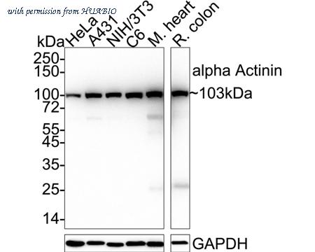 Western blot analysis of alpha Actinin on different lysates with Rabbit anti-alpha Actinin antibody (ER1803-60) at 1/5,000 dilution. Lane 1: A431 cell lysate Lane 2: NIH/3T3 cell lysate Lane 3: C6 cell lysate Lane 4: COS-1 cell lysate Lane 5: Mouse heart tissue lysate Lane 6: Rat colon tissue lysate Lysates/proteins at 20 µg/Lane. Predicted band size: 103 kDa Observed band size: 103 kDa Exposure time: 10 seconds; ECL: K1801; 4-20% SDS-PAGE gel. Proteins were transferred to a PVDF membrane and blocked with 5% NFDM/TBST for 1 hour at room temperature. The primary antibody (ER1803-60) at 1/5,000 dilution was used in 5% NFDM/TBST at 4℃ overnight. Goat Anti-Rabbit IgG - HRP Secondary Antibody (HA1001) at 1/50,000 dilution was used for 1 hour at room temperature.
