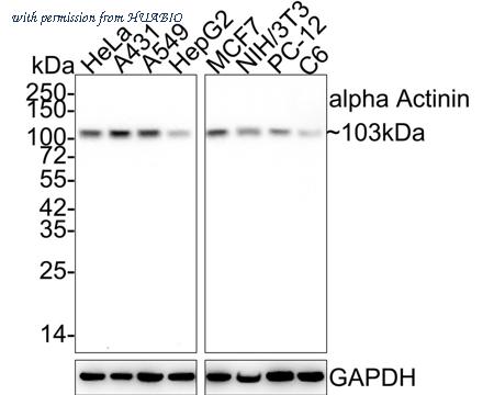 Western blot analysis of alpha Actinin on different lysates with Mouse anti-alpha Actinin antibody (HA601194) at 1/5,000 dilution. Lane 1: HeLa cell lysate (20 µg/Lane) Lane 2: A431 cell lysate (20 µg/Lane) Lane 3: A549 cell lysate (20 µg/Lane) Lane 4: HepG2 cell lysate (20 µg/Lane) Lane 5: MCF7 cell lysate (20 µg/Lane) Lane 6: NIH/3T3 cell lysate (20 µg/Lane) Lane 7: PC-12 cell lysate (20 µg/Lane) Lane 8: C6 cell lysate (20 µg/Lane) Predicted band size: 103 kDa Observed band size: 103 kDa Exposure time: 3 minutes; ECL: K1801; 4-20% SDS-PAGE gel. Proteins were transferred to a PVDF membrane and blocked with 5% NFDM/TBST for 1 hour at room temperature. The primary antibody (HA601194) at 1/5,000 dilution was used in 5% NFDM/TBST at 4℃ overnight. Goat Anti-Mouse IgG - HRP Secondary Antibody (HA1006) at 1/50,000 dilution was used for 1 hour at room temperature.