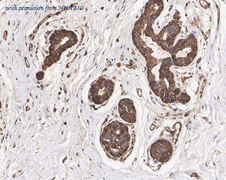 Immunohistochemical analysis of paraffin-embedded human breast tissue with Mouse anti-alpha Actinin antibody (HA610074) at 1/6,000 dilution. The section was pre-treated using heat mediated antigen retrieval with Tris-EDTA buffer (pH 9.0) for 20 minutes. The tissues were blocked in 1% BSA for 20 minutes at room temperature, washed with ddH2O and PBS, and then probed with the primary antibody (HA610074) at 1/6,000 dilution for 1 hour at room temperature. The detection was performed using an HRP conjugated compact polymer system. DAB was used as the chromogen. Tissues were counterstained with hematoxylin and mounted with DPX.