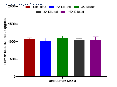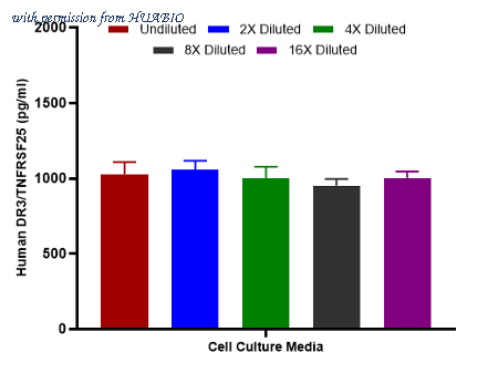 Interpolated concentrations of spiked DR3/TNFRSF25 in human cell culture media samples. Capture: HA723869, Human DR3/TNFRSF25 Rabbit mAb [PSH16-67] Detector: HA723870, Human DR3/TNFRSF25 Rabbit mAb [PSH16-68] The concentrations of DR3/TNFRSF25 were measured in triplicates, interpolated from the DR3/TNFRSF25 standard curves and corrected for sample dilution. Diluted samples are as follows: 50% cell culture media with FBS. The interpolated dilution factor corrected values are plotted (mean +/- SD, n=3).