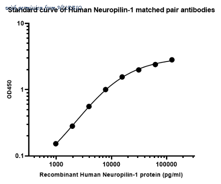 Sandwich ELISA analysis of Human Neuropilin-1 matched pair antibodies Capture: HA725112, Human Neuropilin-1 Rabbit mAb [PSH14-73] Detector: HA725113, Human Neuropilin-1 Rabbit mAb [PSH14-74] Elisa assay was performed by coating wells of a 96-well plate with 50 µl per well of capture antibody (HA725112) diluted in carbonate/bicarbonate buffer, at a concentration of 2 µg/ml overnight at 4℃. Wells of the plate were washed, blocked with 150 µl 0.05% tween-20 1% BSA blocking buffer, and incubated with serial diluted Recombinant Human Neuropilin-1 protein (HA211017) starting from 125,000 pg/ml to 0 pg/ml and detect antibody (HA725113, HRP, 0.2 µg/ml) for 1 hour at 30℃ with shaking. Detection was performed using an Ultra TMB Substrate for 10 minutes at room temperature in the dark. The reaction was stopped with sulfuric acid and absorbances were read on a spectrophotometer at 450 nm.