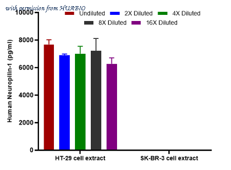 Interpolated concentrations of native Neuropilin-1 in HT-29 and SK-BR-3 extract samples based on a 1,000 µg/ml extract load. Capture: HA725112, Human Neuropilin-1 Rabbit mAb [PSH14-73] Detector: HA725113, Human Neuropilin-1 Rabbit mAb [PSH14-74] The concentrations of Neuropilin-1 were measured in duplicates, interpolated from the Neuropilin-1 standard curve and corrected for sample dilution. Undiluted samples are HT-29 extract 50% and SK-BR-3 extract 50%. The interpolated dilution factor corrected values are plotted (mean +/- SD, n=2). The mean Neuropilin-1 concentration was determined to be 7,020 pg/ml in HT-29 extract and undetectable in SK-BR-3 extract.