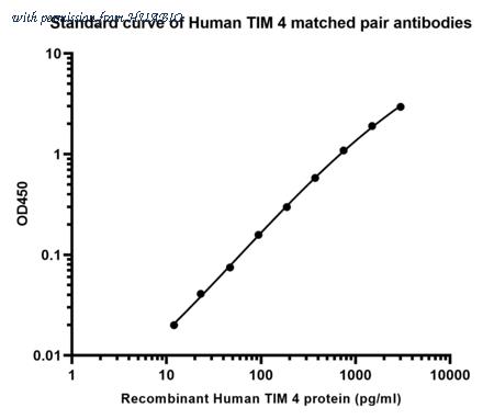 Sandwich ELISA analysis of Human TIM 4 matched pair antibodies Capture: HA723589, Human TIM 4 Rabbit mAb [PSH14-00] Detector: HA723590, Human TIM 4 Rabbit mAb [PSH14-01] Elisa assay was performed by coating wells of a 96-well plate with 100 µl per well of capture antibody (HA723589) diluted in carbonate/bicarbonate buffer, at a concentration of 2ug/ml overnight at 4℃. Wells of the plate were washed, blocked with 150 µl 0.05% tween-20 1% BSA blocking buffer, and incubated with serial diluted Recombinant Human TIM 4 protein (HA211014) protein starting from 3,000 pg/ml to 0 pg/ml and detect antibody (HA723590, Biotin, 0.2 µg/ml) for 1 hour at 30℃ with shaking. Then the plate was washed and incubated with 100 µl per well of SA-HRP for 0.5 hour at 30℃ with shaking. Detection was performed using an Ultra TMB Substrate for 10 minutes at room temperature in the dark. The reaction was stopped with sulfuric acid and absorbances were read on a spectrophotometer at 450 nm.