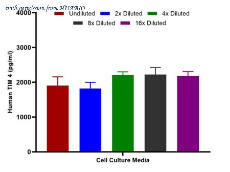 Interpolated concentrations of spiked TIM 4 in cell culture media samples. Capture: HA723589, Human TIM 4 Rabbit mAb [PSH14-00] Detector: HA723590, Human TIM 4 Rabbit mAb [PSH14-01] The concentrations of TIM 4 were measured in duplicates, interpolated from the TIM 4 standard curves and corrected for sample dilution. Undiluted samples are as follows: cell culture media 50%. The interpolated dilution factor corrected values are plotted (mean +/- SD, n=2).