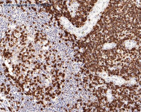 Immunohistochemical analysis of paraffin-embedded human lymph nodes tissue with Rabbit anti-CD5 antibody (HA721137) at 1/1,500 dilution. The section was pre-treated using heat mediated antigen retrieval with Tris-EDTA buffer (pH 9.0) for 20 minutes. The tissues were blocked in 1% BSA for 20 minutes at room temperature, washed with ddH2O and PBS, and then probed with the primary antibody (HA721137) at 1/1,500 dilution for 1 hour at room temperature. The detection was performed using an HRP conjugated compact polymer system. DAB was used as the chromogen. Tissues were counterstained with hematoxylin and mounted with DPX.