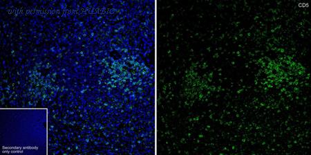 Immunohistochemical analysis of paraffin-embedded human spleen tissue with Rabbit anti-CD5 antibody (ET7110-56) at 1/200 dilution. The section was pre-treated using heat mediated antigen retrieval with Tris-EDTA buffer (pH 8.0-8.4) for 20 minutes. The tissues were blocked in 1% BSA for 20 minutes at room temperature, washed with ddH2O and PBS, and then probed with the primary antibody (ET7110-56) at 1/200 dilution for 0.5 hour at room temperature. The detection was performed using an HRP conjugated compact polymer system. DAB was used as the chromogen. Tissues were counterstained with hematoxylin and mounted with DPX.