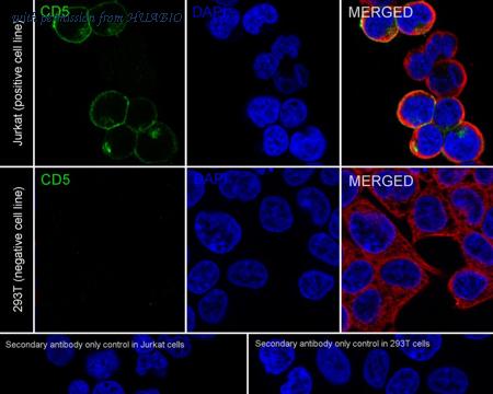 Immunocytochemistry analysis of Jurkat (positive) and 293T (negative) labeling Human CD5 with Rabbit anti-Human CD5 antibody (HA722210) at 1/100 dilution. Cells were fixed in 4% paraformaldehyde for 20 minutes at room temperature, permeabilized with 0.1% Triton X-100 in PBS for 5 minutes at room temperature, then blocked with 1% BSA in 10% negative goat serum for 1 hour at room temperature. Cells were then incubated with Rabbit anti-Human CD5 antibody (HA722210) at 1/100 dilution in 1% BSA in PBST overnight at 4 ℃. Goat Anti-Rabbit IgG H&L (iFluor™ 488, HA1121) was used as the secondary antibody at 1/1,000 dilution. PBS instead of the primary antibody was used as the secondary antibody only control. Nuclear DNA was labelled in blue with DAPI. Beta tubulin (M1305-2, red) was stained at 1/100 dilution overnight at +4℃. Goat Anti-Mouse IgG H&L (iFluor™ 594, HA1126) was used as the secondary antibody at 1/1,000 dilution.