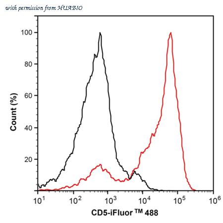 Flow cytometric analysis of human peripheral blood lymphocytes labeling Human CD5. Cells were washed twice with cold PBS and resuspend. Then stained with the primary antibody (HA722210, 1μg/mL) (red). After incubation of the primary antibody at +4℃ for an hour, the cells were stained with a iFluor™ 488 conjugate-Goat anti-Rabbit IgG Secondary antibody (HA1121) at 1/1,000 dilution for 30 minutes at +4℃. Unlabelled sample was used as a control (cells without incubation with primary antibody; black).