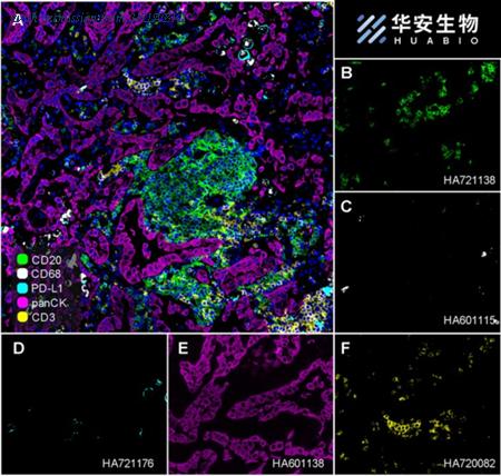 Fluorescence multiplex immunohistochemical analysis of the human non-small cell lung cancer (Formalin/PFA-fixed paraffin-embedded sections). Panel A: the merged image of anti-CD20 (HA721138, green), anti-CD68 (HA601115, gray), anti-PD-L1 (HA721176, cyan), anti-panCK (HA601138, magenta) and anti-CD3 (HA720082, yellow) on human non-small cell lung cancer. Panel B: anti- CD20 stained on B cells. Panel C: anti-CD68 stained on macrophage M1 and macrophage M2. Panel D: anti-PD-L1 stained on dendritic cells and macrophages cells. Panel E: anti-panCK stained on cancer cells. Panel F: anti-CD3 stained on T cells. HRP Conjugated UltraPolymer Goat Polyclonal Antibody HA1119/HA1120 was used as a secondary antibody. The immunostaining was performed with the Sequential Immuno-staining Kit (IRISKit™MH010101, www.luminiris.cn). The section was incubated in five rounds of staining: in the order of HA721138 (1/1,500 dilution), HA601115 (1/2,000 dilution), HA721176 (1/1,000 dilution), HA601138 (1/3,000 dilution), and HA720082 (1/500 dilution) for 20 mins at room temperature. Each round was followed by a separate fluorescent tyramide signal amplification system. Heat mediated antigen retrieval with Tris-EDTA buffer (pH 9.0) for 30 mins at 95℃. DAPI (blue) was used as a nuclear counter stain. Image acquisition was performed with Olympus VS200 Slide Scanner.
