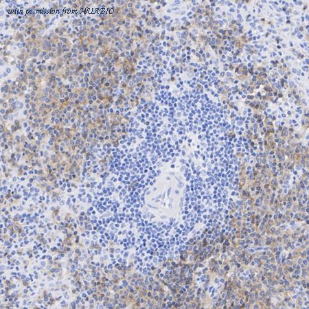 Immunohistochemical analysis of paraffin-embedded human spleen tissue with Rabbit anti-CD20 antibody (HA751207) at 1/200 dilution. The section was pre-treated using heat mediated antigen retrieval with Tris-EDTA buffer (pH 9.0) for 20 minutes. The tissues were blocked in 1% BSA for 20 minutes at room temperature, washed with ddH2O and PBS, and then probed with the primary antibody (HA751207) at 1/200 dilution for 1 hour at room temperature. The detection was performed using an HRP conjugated compact polymer system. DAB was used as the chromogen. Tissues were counterstained with hematoxylin and mounted with DPX.