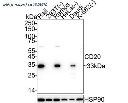 Western blot analysis of CD20 on different lysates with Rabbit anti-CD20 antibody (HA722953) at 1/10,000 dilution. Lane 1: Raji cell lysate Lane 2: 293T cell lysate (negative) Lane 3: Ramos cell lysate Lane 4: HeLa cell lysate (negative) Lane 5: Daudi cell lysate Lane 6: K-562 cell lysate (negative) Lysates/proteins at 20 µg/Lane. Predicted band size: 33 kDa Observed band size: 33 kDa Exposure time: 30 seconds; ECL: K1801; 4-20% SDS-PAGE gel. Proteins were transferred to a PVDF membrane and blocked with 5% NFDM/TBST for 1 hour at room temperature. The primary antibody (HA722953) at 1/10,000 dilution was used in 5% NFDM/TBST at 4℃ overnight. Goat Anti-Rabbit IgG - HRP Secondary Antibody (HA1001) at 1/50,000 dilution was used for 1 hour at room temperature.