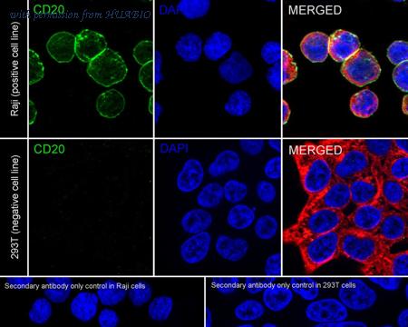 Immunocytochemistry analysis of Raji (positive) and 293T (negative) labeling CD20 with Rabbit anti-CD20 antibody (HA751207) at 1/100 dilution. Cells were fixed in 4% paraformaldehyde for 15 minutes at room temperature, permeabilized with 0.1% Triton X-100 in PBS for 15 minutes at room temperature, then blocked with 1% BSA in 10% negative goat serum for 1 hour at room temperature. Cells were then incubated with Rabbit anti-CD20 antibody (HA751207) at 1/100 dilution in 1% BSA in PBST overnight at 4 ℃. Goat Anti-Rabbit IgG H&L (iFluor™ 488, HA1121) was used as the secondary antibody at 1/1,000 dilution. PBS instead of the primary antibody was used as the secondary antibody only control. Nuclear DNA was labelled in blue with DAPI. Beta tubulin (HA601187, red) was stained at 1/100 dilution overnight at +4℃. Goat Anti-Mouse IgG H&L (iFluor™ 594, HA1126) was used as the secondary antibody at 1/1,000 dilution.