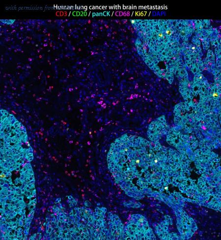 mIHC analysis of human lung cancer with brain metastasis tissue (Formalin/PFA-fixed paraffin-embedded sections) with CD3, CD20 (IRS003), panCK (IRS010), CD68 (IRS004) and Ki67 antibody at 1/100 dilution. The immunostaining was performed with the IRISKitCmTSA Kit (900802). Heat mediated antigen retrieval with Tris-EDTA buffer (pH 9.0) for 30 mins at 95℃. DAPI (blue) was used as a nuclear counter stain. Image acquisition was performed with Olympus VS200 Slide Scanner.