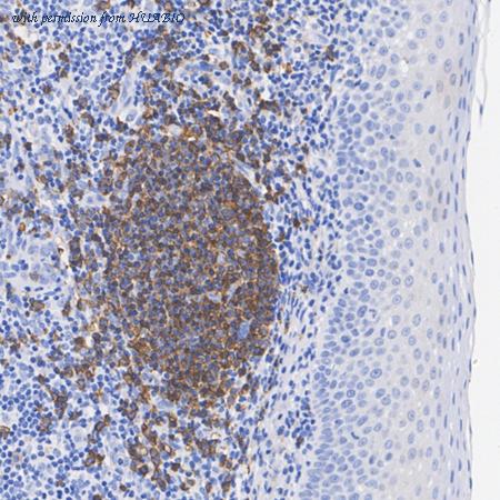 Immunohistochemical analysis of paraffin-embedded human tonsil tissue with Mouse anti-CD20 antibody (HA601544) at 1/20,000 dilution. The section was pre-treated using heat mediated antigen retrieval with Tris-EDTA buffer (pH 9.0) for 20 minutes. The tissues were blocked in 1% BSA for 20 minutes at room temperature, washed with ddH2O and PBS, and then probed with the primary antibody (HA601544) at 1/20,000 dilution for 1 hour at room temperature. The detection was performed using an HRP conjugated compact polymer system. DAB was used as the chromogen. Tissues were counterstained with hematoxylin and mounted with DPX.