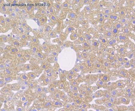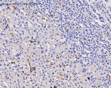 Immunohistochemical analysis of paraffin-embedded human liver tissue with Rat anti-CD163 antibody (HA601549) at 1/1,000 dilution. The section was pre-treated using heat mediated antigen retrieval with Tris-EDTA buffer (pH 9.0) for 20 minutes. The tissues were blocked in 1% BSA for 20 minutes at room temperature, washed with ddH2O and PBS, and then probed with the primary antibody (HA601549) at 1/1,000 dilution for 1 hour at room temperature. The detection was performed using an HRP conjugated compact polymer system. DAB was used as the chromogen. Tissues were counterstained with hematoxylin and mounted with DPX.