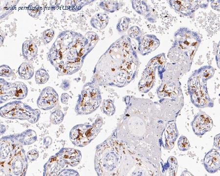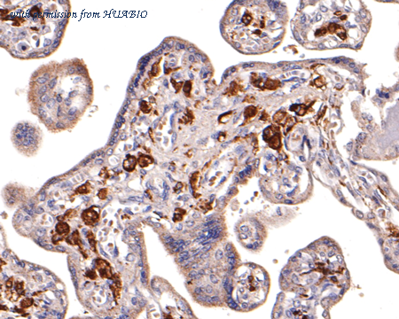 Immunohistochemical analysis of paraffin-embedded human placenta tissue with Rat anti-CD163 antibody (HA601549) at 1/1,000 dilution. The section was pre-treated using heat mediated antigen retrieval with Tris-EDTA buffer (pH 9.0) for 20 minutes. The tissues were blocked in 1% BSA for 20 minutes at room temperature, washed with ddH2O and PBS, and then probed with the primary antibody (HA601549) at 1/1,000 dilution for 1 hour at room temperature. The detection was performed using an HRP conjugated compact polymer system. DAB was used as the chromogen. Tissues were counterstained with hematoxylin and mounted with DPX.