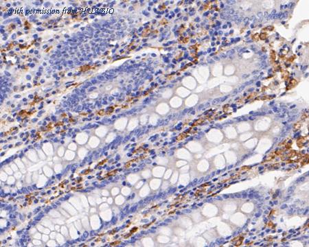 Immunohistochemical analysis of paraffin-embedded human colon tissue using anti-CD163 antibody. The section was pre-treated using heat mediated antigen retrieval with Tris-EDTA buffer (pH 8.0-8.4) for 20 minutes.The tissues were blocked in 5% BSA for 30 minutes at room temperature, washed with ddH2O and PBS, and then probed with the primary antibody (EM1901-91, 1/200) for 30 minutes at room temperature. The detection was performed using an HRP conjugated compact polymer system. DAB was used as the chromogen. Tissues were counterstained with hematoxylin and mounted with DPX.