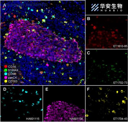 Fluorescence multiplex immunohistochemical analysis of the human cervical cancer (Formalin/PFA-fixed paraffin-embedded sections). Panel A: the merged image of anti-CD14 (ET1610-85, red), anti-S100A9 (ET1702-73, green), anti-CD68 (HA601115, cyan), anti-panCK (HA601138, magenta) and anti-CD163 (ET1704-43, yellow) on human cervical cancer. Panel B: anti- CD14 stained on monocyte and MDSCs. Panel C: anti-S100A9 stained on MDSCs. Panel D: anti-CD68 stained on macrophage M1 and macrophage M2. Panel E: anti-panCK stained on tumor cells. Panel F: anti-CD163 stained on macrophage M2. HRP Conjugated UltraPolymer Goat Polyclonal Antibody HA1119/HA1120 was used as a secondary antibody. The immunostaining was performed with the Sequential Immuno-staining Kit (IRISKit™MH010101, www.luminiris.cn). The section was incubated in five rounds of staining: in the order of ET1610-85 (1/1,000 dilution), ET1702-73 (1/1,000 dilution), HA601115 (1/2,000 dilution), HA601138 (1/3,000 dilution), and ET1704-43 (1/2,000 dilution) for 20 mins at room temperature. Each round was followed by a separate fluorescent tyramide signal amplification system. Heat mediated antigen retrieval with Tris-EDTA buffer (pH 9.0) for 30 mins at 95℃. DAPI (blue) was used as a nuclear counter stain. Image acquisition was performed with Olympus VS200 Slide Scanner.