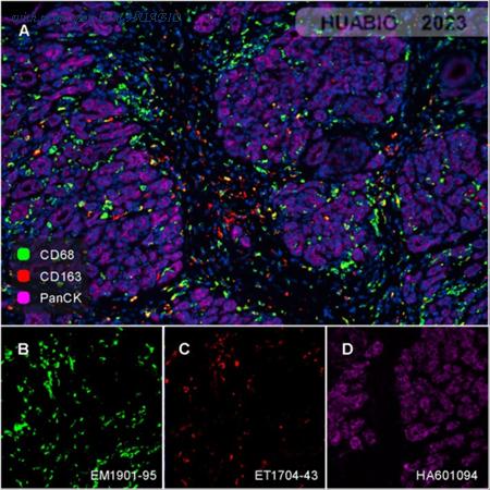 Fluorescence multiplex immunohistochemical analysis of the human pancreatic carcinoma (Formalin/PFA-fixed paraffin-embedded sections). Panel A: the merged image of anti-CD68 (EM1901-95, green), anti-CD163 (ET1704-43, red) and anti-PanCK (HA601094, violet) on human pancreatic carcinoma. Panel B: anti- CD68 stained on M1 macrophages. Panel C: anti-CD163 stained on M2 macrophages cells. Panel D: anti-panCK stained on cancer cells. HRP Conjugated UltraPolymer Goat Polyclonal Antibody HA1119/HA1120 was used as a secondary antibody. The immunostaining was performed with the Sequential Immuno-staining Kit (IRISKitCmTSA Kit 900803). The section was incubated in three rounds of staining: in the order of EM1901-95 (1/3,000 dilution), ET1704-43 (1/3,000 dilution), and HA601094 (1/3,000 dilution) for 20 mins at room temperature. Each round was followed by a separate fluorescent tyramide signal amplification system. Heat mediated antigen retrieval with Tris-EDTA buffer (pH 9.0) for 30 mins at 95℃. DAPI (blue) was used as a nuclear counter stain. Image acquisition was performed with Nikon ECLIPSE Ni-E microscope.
